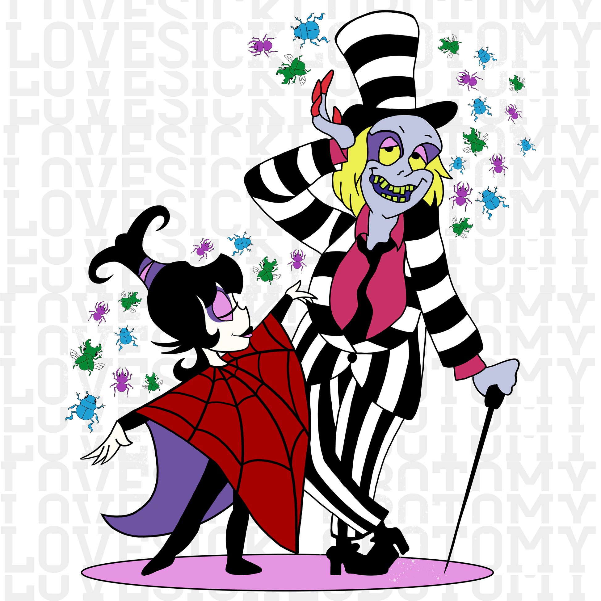 Dive into the spooky charm of Beetlejuice with this FREE digital fan art featuring Beetlejuice and Lydia! This artwork captures the duo in a whimsical pose, surrounded by a sparkle of colorful rainbow beetles—perfect for fans who adore their quirky, otherworldly energy.