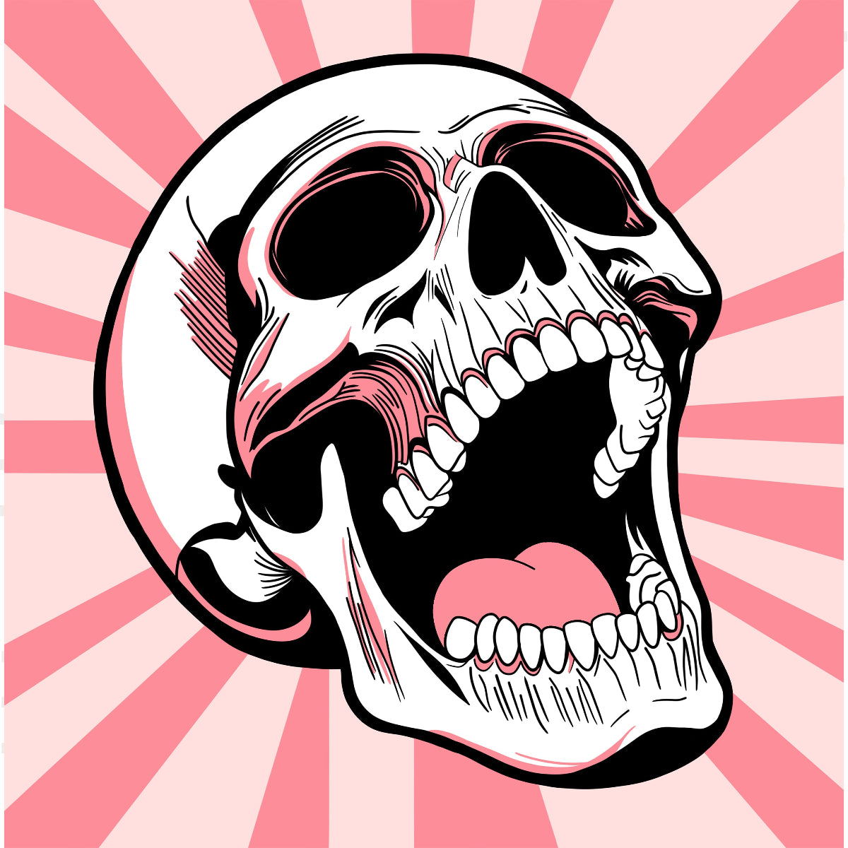 This striking pop art-style skull artwork is perfect for adding a bold statement to any space. Featuring vibrant pink rays and intricate skull detailing, this digital design embodies edgy and modern aesthetics.