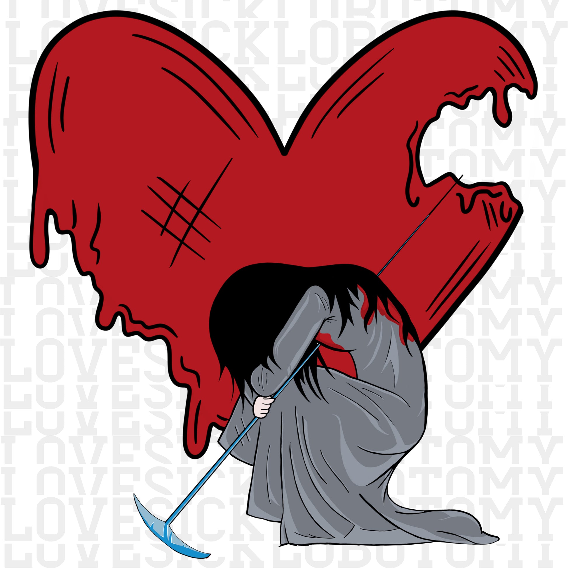 This bold and evocative artwork captures a haunting scene—a girl piercing herself with a pickaxe in front of a melting heart. A powerful visual representation of self-destruction, pain, and raw emotion, this piece is perfect for lovers of dark, thought-provoking, and surreal art.