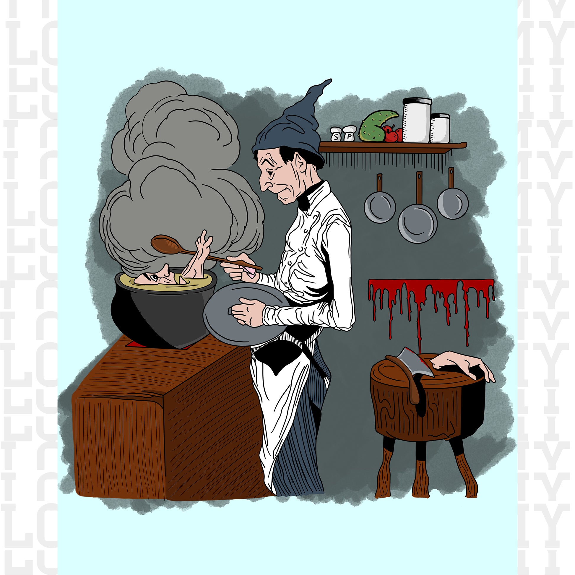 Step into a world of macabre cuisine with this eerie digital artwork featuring a mysterious man stirring a stew filled with floating body parts. A perfect piece for horror lovers, dark humor enthusiasts, and fans of the bizarre, this artwork blends unsettling imagery with a twisted sense of humor.